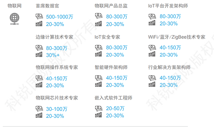 物联网领域整体薪酬呈现20-30%正常增幅,边缘计算、数字孪生等新兴技术方向由于领域细分人员获取面较窄,薪酬涨幅趋势个体差异较大,但是总体可在30%以上。