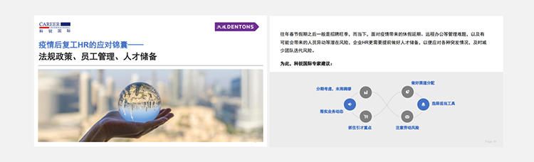 为了帮助众多企业人力资源工作者应对挑战,凯发K8国际国际联合国内知名律所“大成律师事务所”,推出疫情后《复工HR的应对锦囊》手册,从法律政策、员工管理、人选储备几个方面对企业HR有序召开复工后的各项人力资源管理给予帮助。